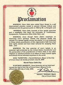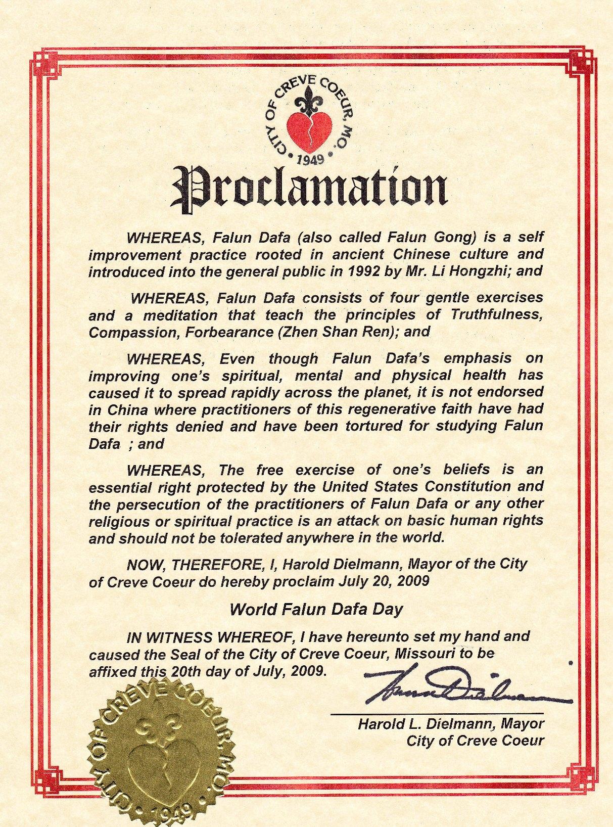 为支持法轮功学员的十年反迫害,密苏里州柯里弗科市(Creve Coeur)市长给法轮大法颁发褒奖,褒奖令中说,“信仰自由是受美国宪法保护的一项基本权利,对法轮大法修炼者和其他任何宗教或信仰信奉者的迫害是对基本人权的践踏,是世界上任何地方都不能容忍的。”以下为褒奖译文。