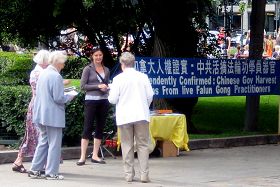 一位台湾的游客说,他几个月前去过中国。他知道现在真实的中国,中国人有很多冤屈无处伸。一位学员讲述了自己在中国亲身经历的迫害,他很震惊。学员又讲了法轮功学员为什么办退!党!活动,学员说:善恶终有报,今天《·九·评*》这本书的问世,引发了到目前为止五千七百多万的退!党!,正是中共作恶多端的结果,是中共自己将自己打倒了。学员还讲了法轮功学员没有获得政权的企图,他们所做的一切就是揭露中共对法轮功的迫害,同时制止迫害,唤醒中国人的良知善念。那位台湾的男士听后很是感动,在离开时说:“我拍了很多照片,我保留下来,我会支持你们!”