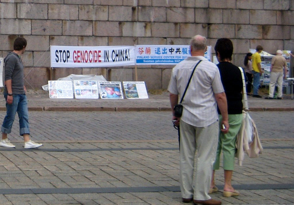 ![]() 芬兰法轮功学员举办反迫害、声援退出中共活动,路人了解真相。 |