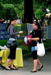 一位来自新加坡的游客,看到这些被折磨致死的法轮功学员遗照后,提出了很多问题。她问为什么中国现在仍然可以信仰佛教和其它的教,而不可以信仰法轮功?学员告诉她,在中国你信仰佛教,那么中共就得是佛祖的佛祖;如果你信仰耶稣,那中共就得是耶稣的耶稣;在中国并没有真正的信仰自由。最后那位新加坡女士完全明白了在中国发生的这场迫害;当学员告诉她这些所有活动的费用都是法轮功学员省吃俭用的钱,她很是同情。