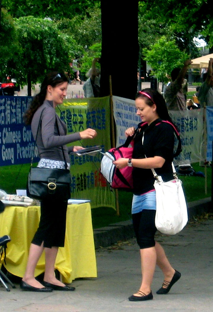 看到横幅和展板后,有两位芬兰妇女前来询问,这到底发生了什么事?学员解释了这场在中国至今仍发生的迫害,那些是被迫害致死的法轮功学员的图片。他们非常吃惊,惊讶于现在仍发生着这么可怕的事情。学员解释,在此办活动的目的,是要更多的人能知道正在中国发生的这场迫害,他们表示支持学员们的举动,并衷心希望迫害能早日停止。
