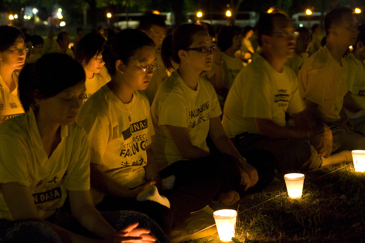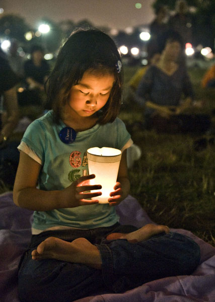 从澳洲来华府旅游的琼安(Jonnane)和同伴从烛光夜悼现场经过。教授瑜伽的琼安对打坐颇有兴趣,对纯洁的烛光也是情有独钟。看到这个场面,她最强烈的感觉就是平和。两人都频频用相机留下这庄严祥和的一幕。原本不了解法轮功的他们听到发生在中国的迫害深感震惊,并对法轮功学员反迫害表示支持。
