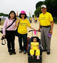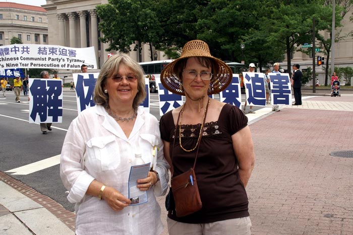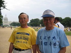 已经七十五岁的孙先生与六十六岁李先生均来自芝加哥。从事贸易工作多年的孙先生是经理,他说,炼功多年,原本失明的左眼能看了,“法轮功是好功法”。所以,他常出来参加反迫害的活动,告诉更多人们法轮大法的真相。