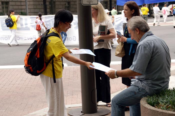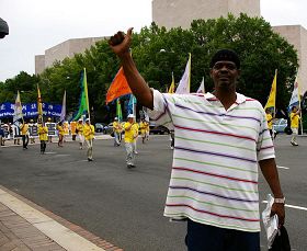法轮功反迫害游行队伍经过时,不时路人驻足观看,并了解真相。其中,有一位练太极的西人民众当知道法轮功免费教功后,表示讶异,因为学太极在国外是要花费的、而且很贵;而修炼法轮功不但对身体有益,对心性精神的提升也很有帮助,他对如何学炼法轮功表示兴趣。