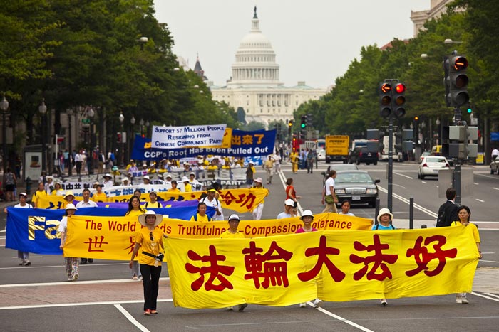 二零零九年七月二十日是法轮功学员反对中共迫害十周年的日子。今年的游行队伍于中午十二点半从国会山庄西草坪上出发,顺着宾夕法尼亚大道,“法轮大法好”、“停止迫害法轮功”、“法办江泽民、罗干、刘京、周永康”、“解体中共才能停止迫害”等数十面巨型横幅,行进在游行队伍的最前面;不同种族、不同肤色的法轮功学员手中举着数不清的“法轮大法好”,“世界需要真善忍”等横幅和展板走在队伍中。