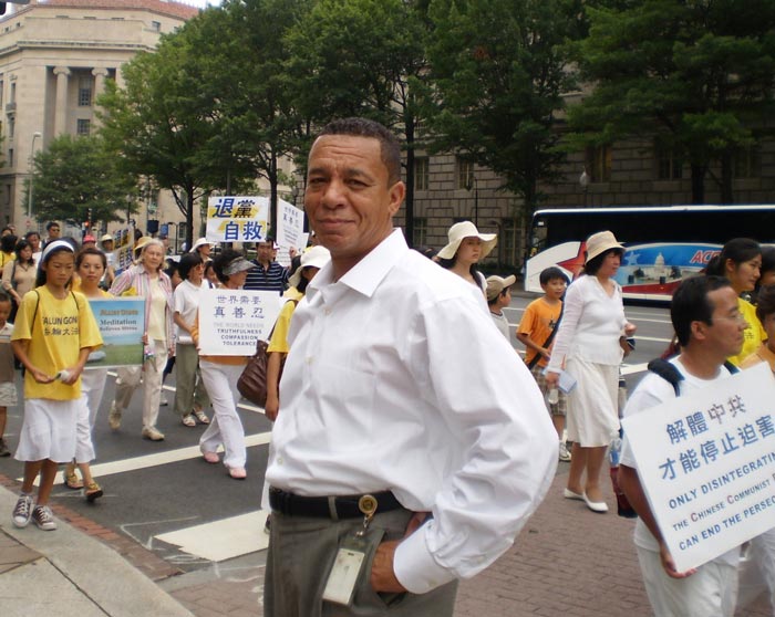 在财政部工作的杰瑞(Jerald)面带微笑的看着法轮功学员游行,他说:“人们为了自己的信仰而发声,这很好。为那些在自己的祖国里发生的不公正的事情而抗议,在这里他们拥有这样的自由,这很好。”