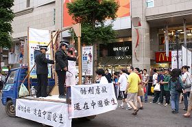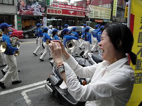 ![]() 陈小姐兴奋地拿出相机,并对游行队伍说:“法轮功加油!” |