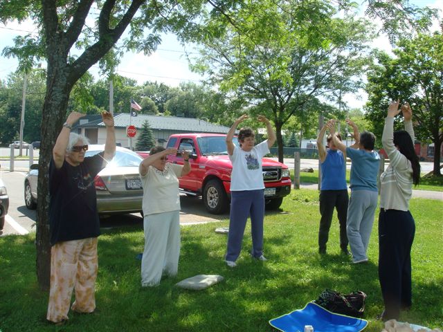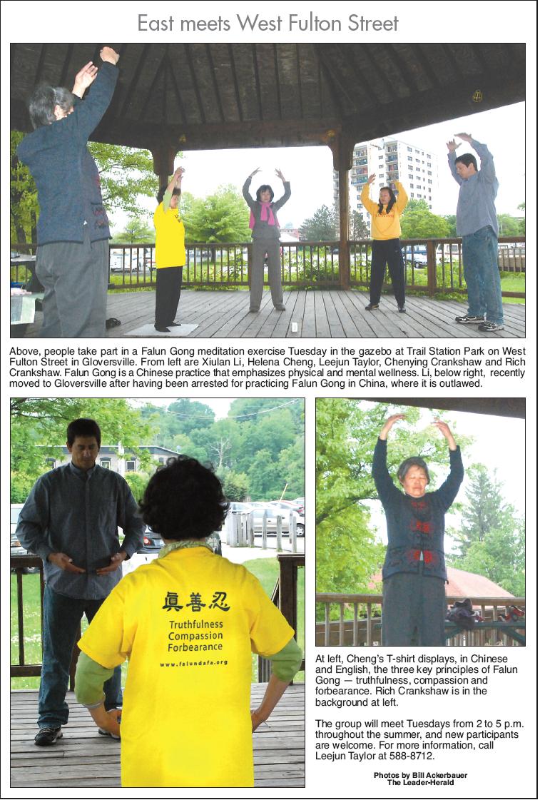 报道的上图文字说明是,星期二人们在格劳维斯市(Gloversville)的西福顿街(West Fulton Street)雪道站公园(Trail Station Park)炼法轮功的情形。从左到右李秀兰、海林娜•程,李涓•泰勒,陈颖•科润珂,李察德•科润珂,法轮功是中国的一种(传统的)能使人身心受益的修炼功法。
