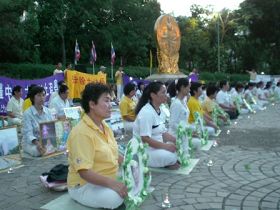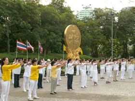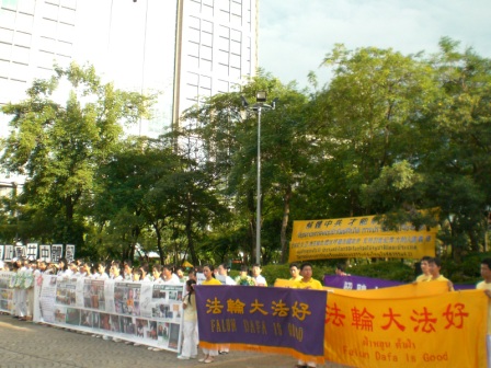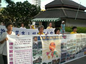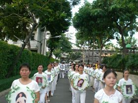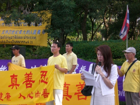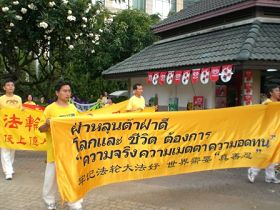 七月十七日下午,泰国法轮功学员来到曼谷皇后公园,举行反迫害十周年集会游行,逃离大陆来到泰国的中国法轮功学员,以亲身经历揭露了中共对法轮功的残酷迫害。