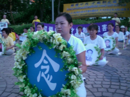 晚上,法轮功学员点起盏盏烛光,悼念同修,场面庄严,肃穆。烛光象征着希望,表达着心声,呼唤着正义良知。