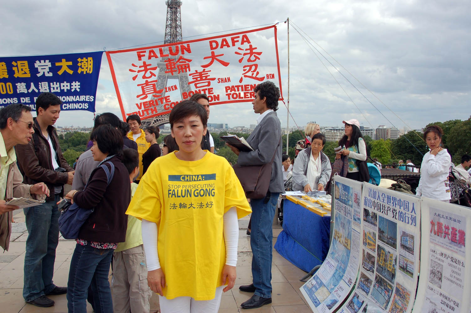 自一九九九年七月二十日中共开始迫害法轮功起,法国的法轮功学员们就在这个世界著名的景点——埃菲尔铁塔下的人权广场上拉起了“法轮大法好”、“停止迫害法轮功”等横幅,向民众讲真相,向法国政府、向来自世界各地的游人讲真相。整整十个年头,无论严寒酷暑都没有动摇法轮功学员的信念:正义必将战胜邪恶,迫害注定失败。