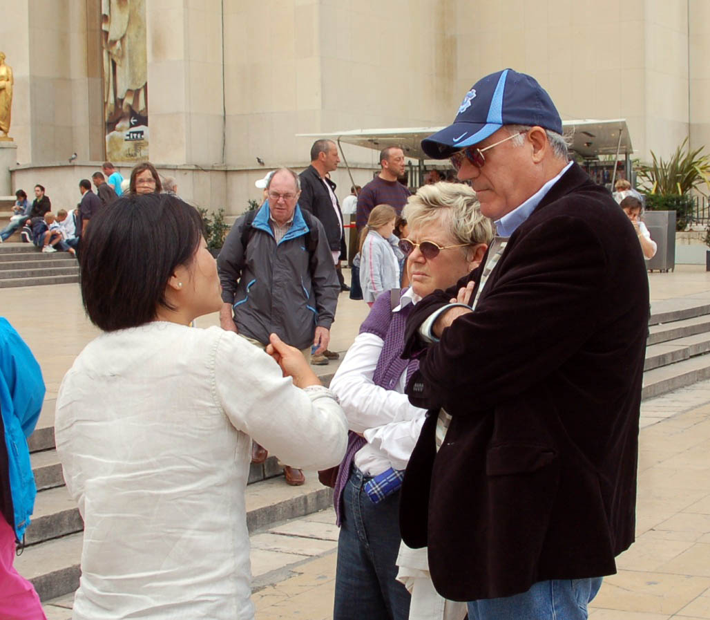 一对法国父子说,以前不了解法轮功,现在看到了,真是很好的功法,谢谢法轮功学员把这么好的信息告诉他们。