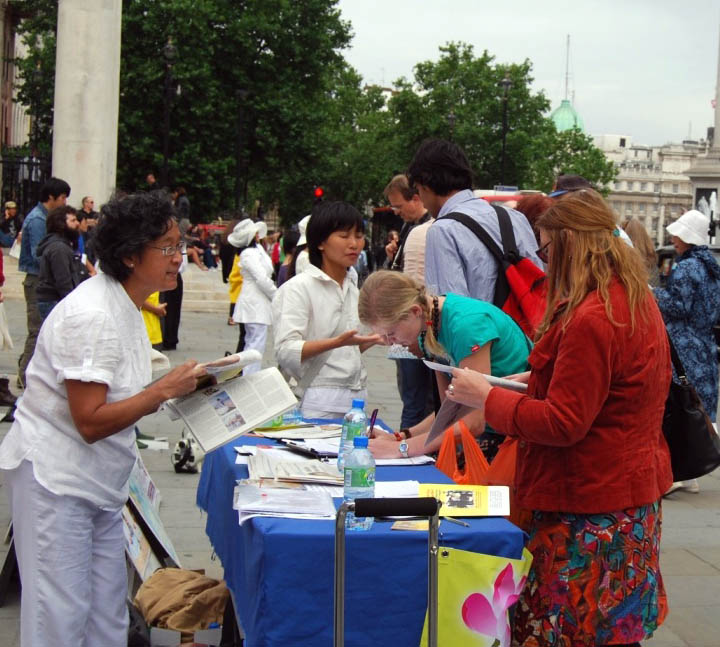 ![]() 伦敦人乔(Joe,图中穿红衣者)在征签表上签名,她说:“真、善、忍是世界上任何人都需要的。” |