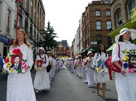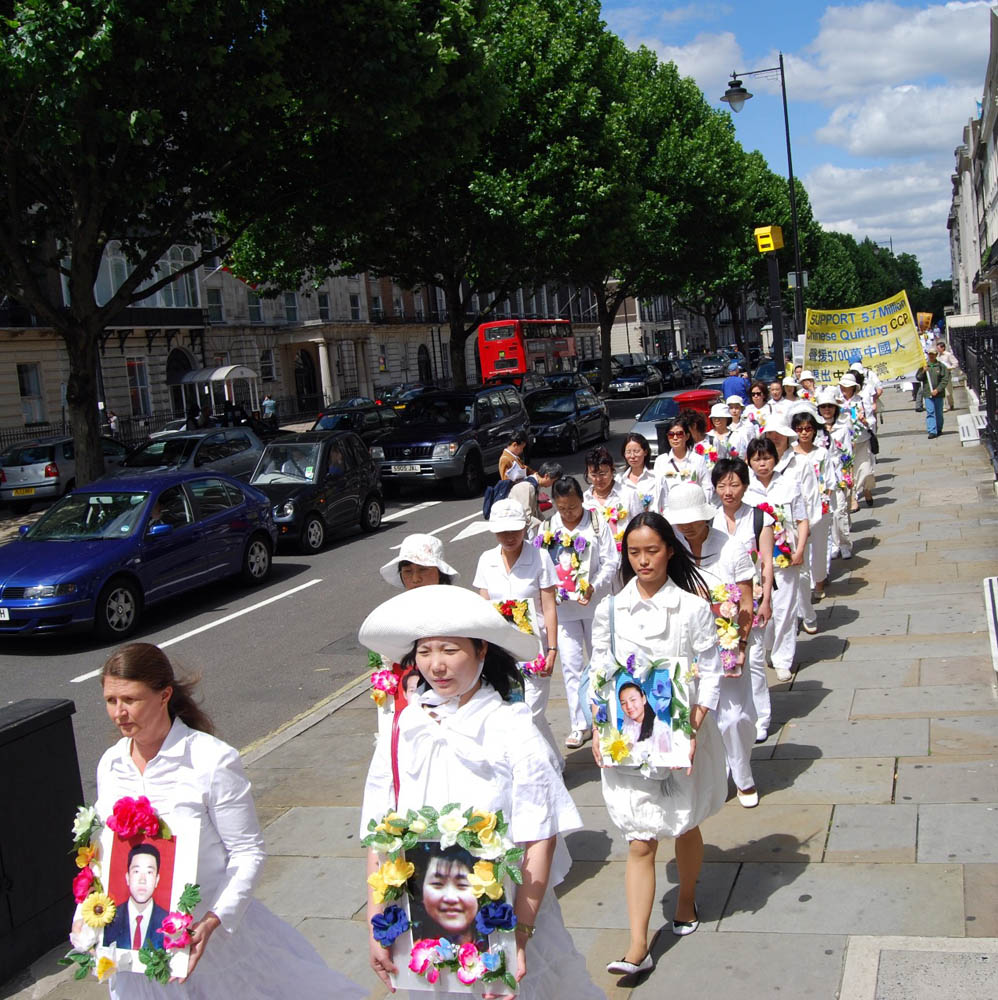 下午一点,游行从中共使馆前开始。游行队伍的最前面是“法轮大法好”和“世界需要真、善、忍”大横幅,后面,数十位身穿白色衣衫的法轮功女学员,捧着被中共迫害致死的部份中国法轮功学员遗像,神情庄严肃穆地行进着。再后面,几十位法轮功学员手举着“制止迫害法轮功”、“解体中共 停止迫害”、“声援5700万中国人退出中共恶党”、“天灭中共 天佑中华”等中英文横幅和标语牌。学员们还沿途向民众分发真相传单,呼吁民众关注迫害,伸出援手,共同制止这场达十年之久的浩劫。