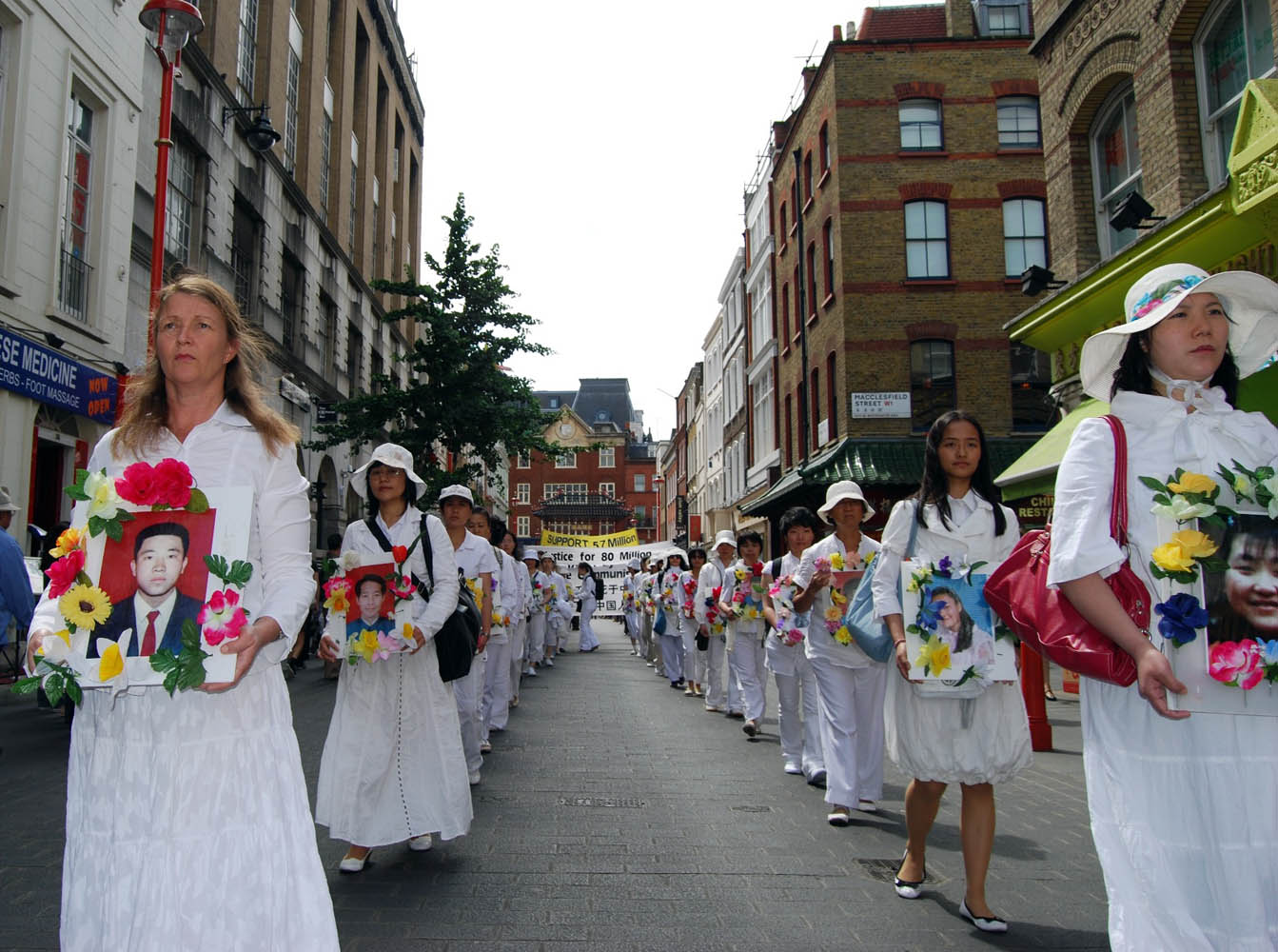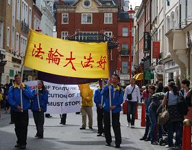 游行队伍沿着伦敦最繁忙的商业街摄政街(Regent Street)行进到中国城,最后来到国家美术馆旁的圣马丁广场,历时两个多小时。沿途中人流熙攘,人们纷纷停下脚步,观看游行。许多人拿出相机、手机拍照;许多人睁大眼睛看一面面横幅上的字;还有许多人接过传单仔细阅读。