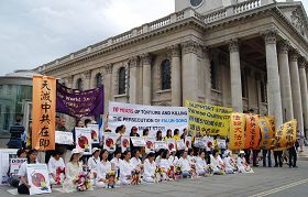 最后,游行队伍来到圣马丁广场。法轮功学员们摆出真相展板,展示功法,并散发中英文真相传单和报纸,向人们征集签名,呼吁国际社会调查中共摘取法轮功学员人体器官的罪行,制止中共的迫害。