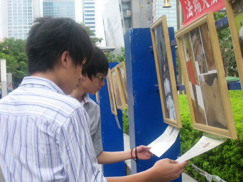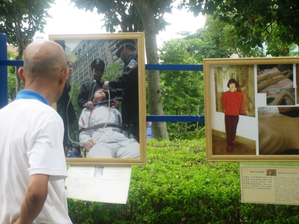 信义广场的这一边,一帧帧纪录法轮功学员走过十年反迫害历程的图片,让许多驻足观看的民众对法轮功有了进一步的了解,同时对中共施加在法轮功学员身上的残酷暴行感到震惊。