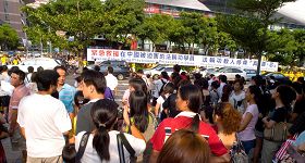 ![]() 假日的午后,台北一零一大楼前广场聚集许多民众及大陆游客观看法轮功游行 |