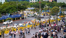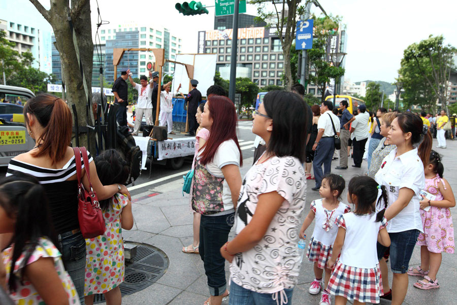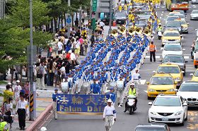 游行队伍由声势浩壮的天国乐团开路,用一首首庄严的乐曲告诉台湾民众法轮大法在世界的洪传。笑容可掬的仙女队、认真专注的小弟子腰鼓队和展示法轮功五套功法的炼功方阵都引来行人的围观。然而,让全世界上亿人身心健康的修炼法门,却在中国大陆惨遭迫害。学员们通过真人模拟的方式,揭露中共酷刑和活体摘取器官的罪恶。