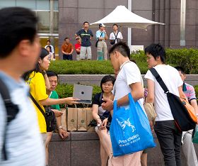 ![]() 中国大陆游客在台北一零一大楼前观看法轮功游行队伍 |