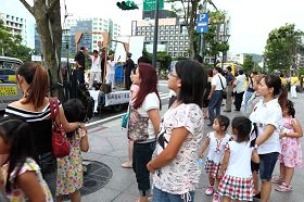 从芦洲来的淑蕙,带着两个女儿一起参加游行,二女儿并沿途向过往行人发送真相资料。淑蕙表示虽然大部份台湾人对法轮功是支持的,但其实还是不了解共产党是什么,法轮功是什么。