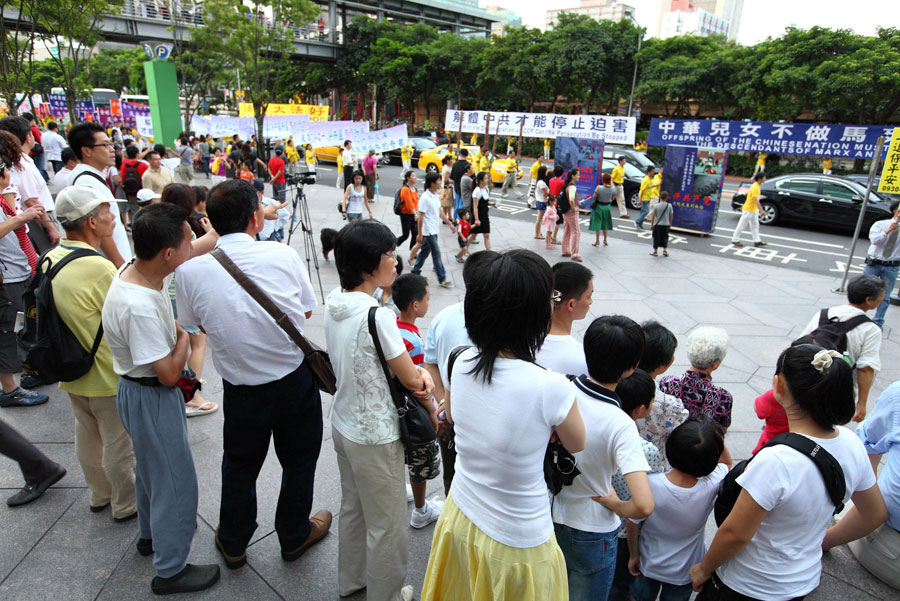 大陆来台的观光旅行团和考察团,由游览车一车一车地载来参观全球最高楼、台湾的地标“台北一零一”。隔着对街望去,八条巨大醒目的横幅“紧急救援在中国被迫害的法轮功学员”、“法轮功教人修炼真、善、忍”、“解体中共才能停止迫害”、“声援五千七百万人退出中国共产党”等就在他们的眼前。