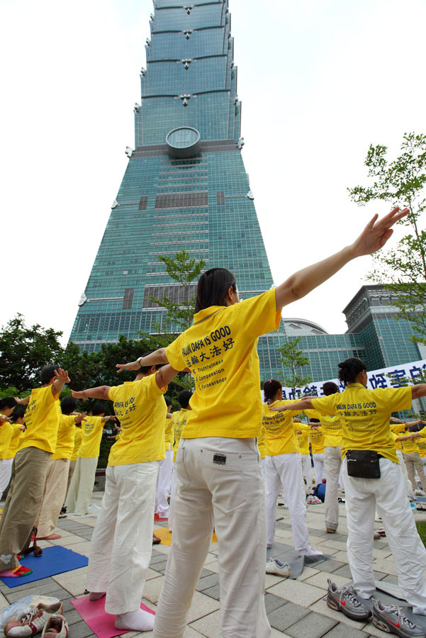 ![]() 中国游客来台的热门景点──台北一零一大楼,每天四点后即有法轮功学员在此炼功洪法 |