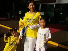 从士林来的黎小姐是越南人,带着七岁的小女儿来参加游行。黎小姐表示她的老板娘是法轮功学员,建议她炼功,本来她觉得自己没有时间,但后来学了之后才知道学炼法轮功不但不会耽误自己平常的工作,而且还让身体变得很健康。现在她看《转法轮》书,如果遇到不懂的中文字,就会把字记下来再去问人。