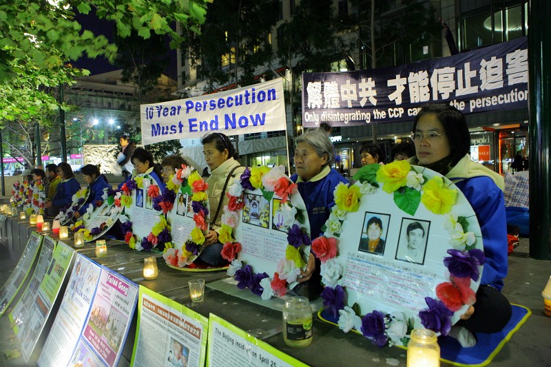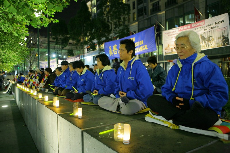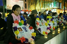 当晚,法轮功学员手持死难同修遗照的花环,整齐的坐在广场中心,点起烛光,悼念在这十年间被证实遭迫害致死的三千二百九十二名法轮功学员,用真诚唤起更多的人了解法轮功真相。