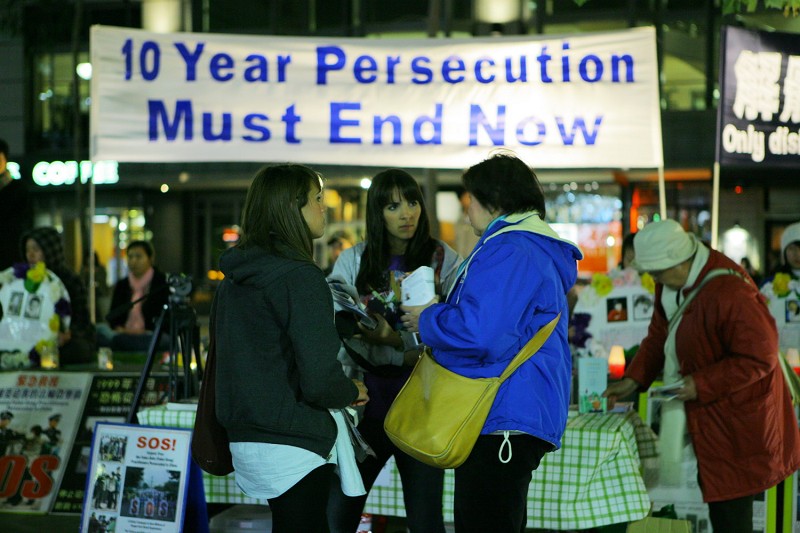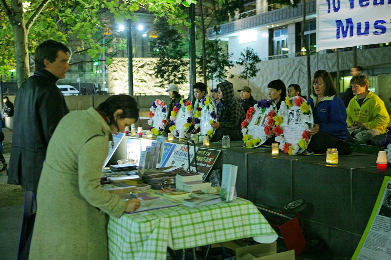 七月二十日晚,墨尔本法轮功学员在市中心城市广场,举行了“法轮功反迫害十周年”烛光悼念活动。