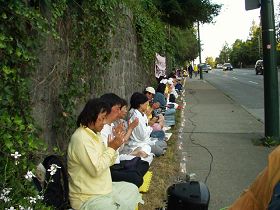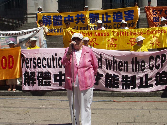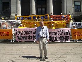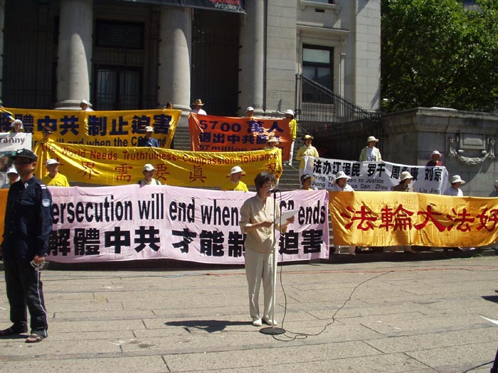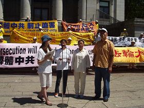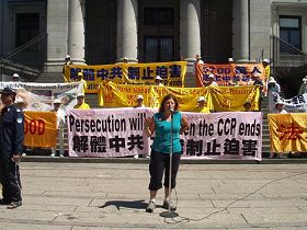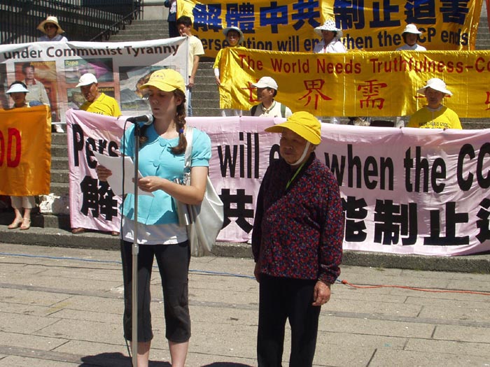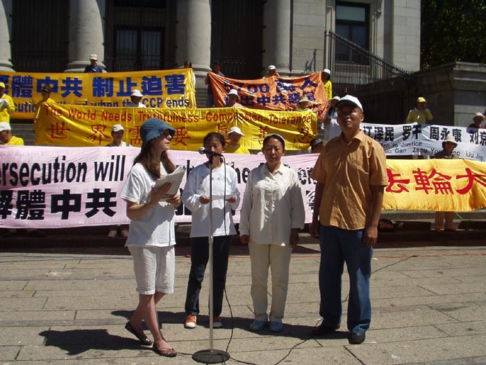 集会开始,法轮功学员张素宣读了加拿大法轮大法学会就反迫害十周年的声明。声明说:到今年七月二十日,中共对法轮功最残忍的迫害整十年,也是法轮功学员和平反迫害十周年。在这十年期间,超过三千二百九十名法轮功学员被迫害致死,实际数字比这更高。