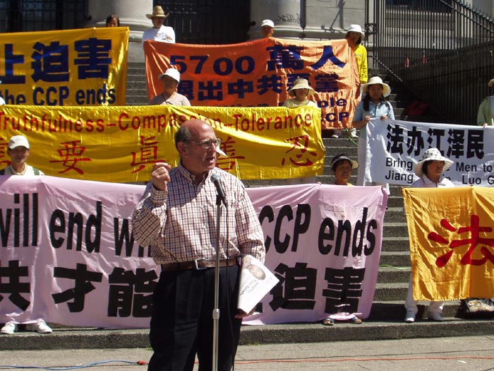 卑诗省医院工会前主席Fred Musin在演讲中谴责中共对法轮功长达十年的迫害。