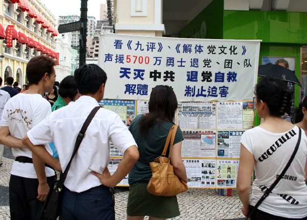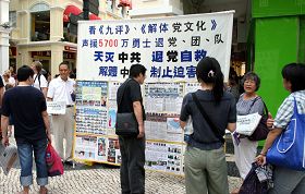 正值暑假,大陆游客很多,尤其是年轻人,都趁学校放假,到澳门观光购物。下午约二点半,学员刚举起横额,就有一位十几岁的年轻人来拿资料,并对学员说:“其实我们都知道,我们私下都互相议论中共的不好,只是没有办法。”学员对他说:“不是没有办法,只要大家都看《·九·评*共产党》,认清中共的真面目,不配合它行恶,它就没办法了。”学员并向他讲述三:退.的重要性,年轻人点头称是,并当场退了团,同时表示会把三:退.的讯息带给自己的朋友。