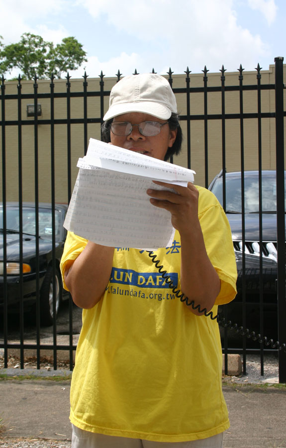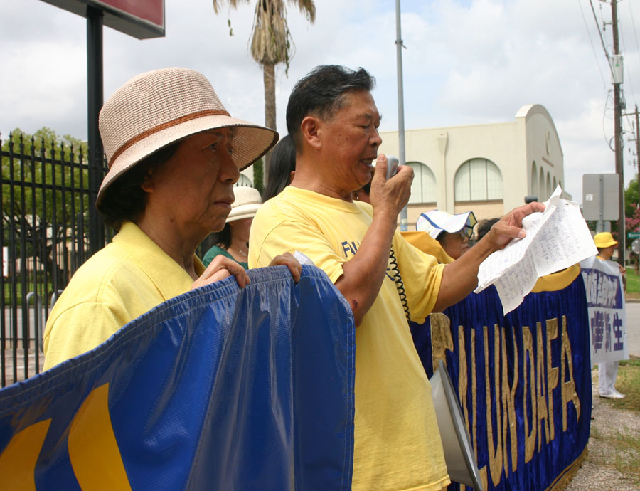 他表示,这十年里,休士顿法轮功学员曾向中领馆递交过有关制止迫害法轮功的信件,在中领馆前炼功、讲真相。如今有越来越多的人们,尤其中国大陆的人们了解了法轮功的真相,了解了中共的邪恶本质,并引发三:退.(退出中共党、团、队)大潮,人们摆脱中共,走向新生。法轮功学员向社会有良知的人们呼吁:共同终止这长达十年的迫害。