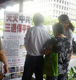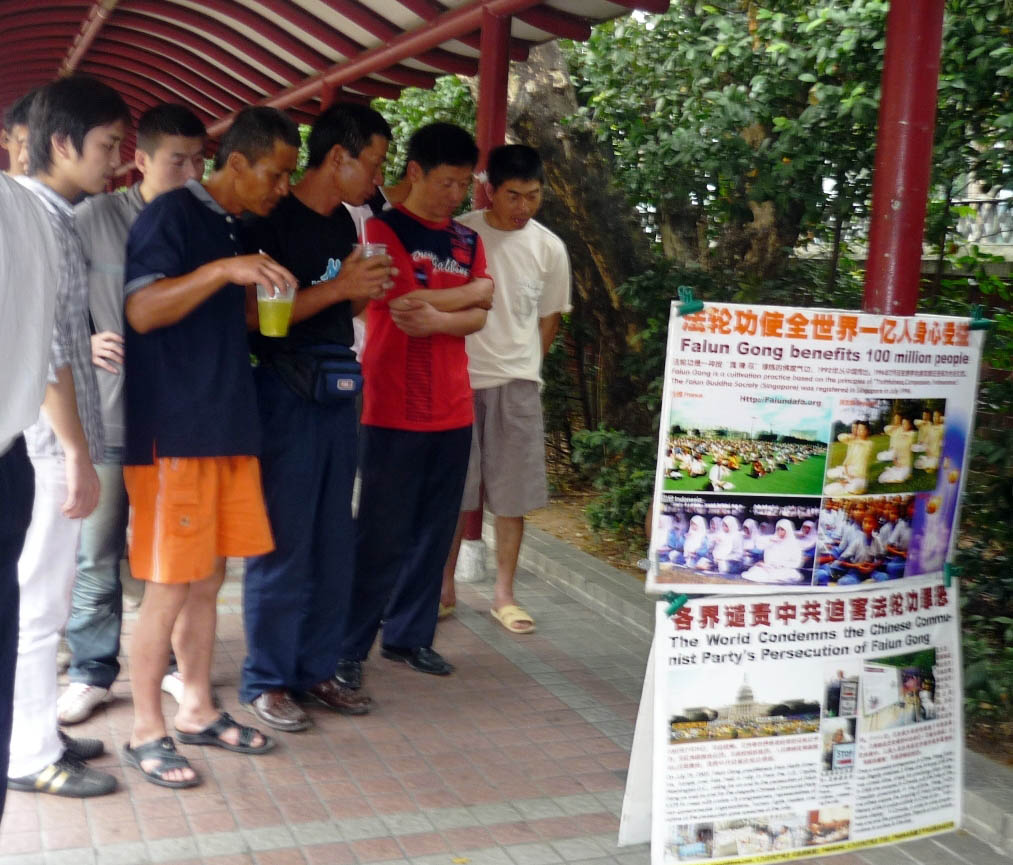 对于少数不明真相的华人,学员们就及时告诉:“隐瞒真相、制造谎言、使很多人不明是非才过分!”不少中国客工在展板前停住脚步,认真地看着,他们都看过《大.纪.元;时报》,有的早就做了“三:退.”。