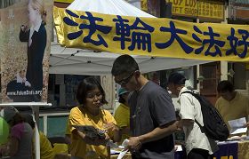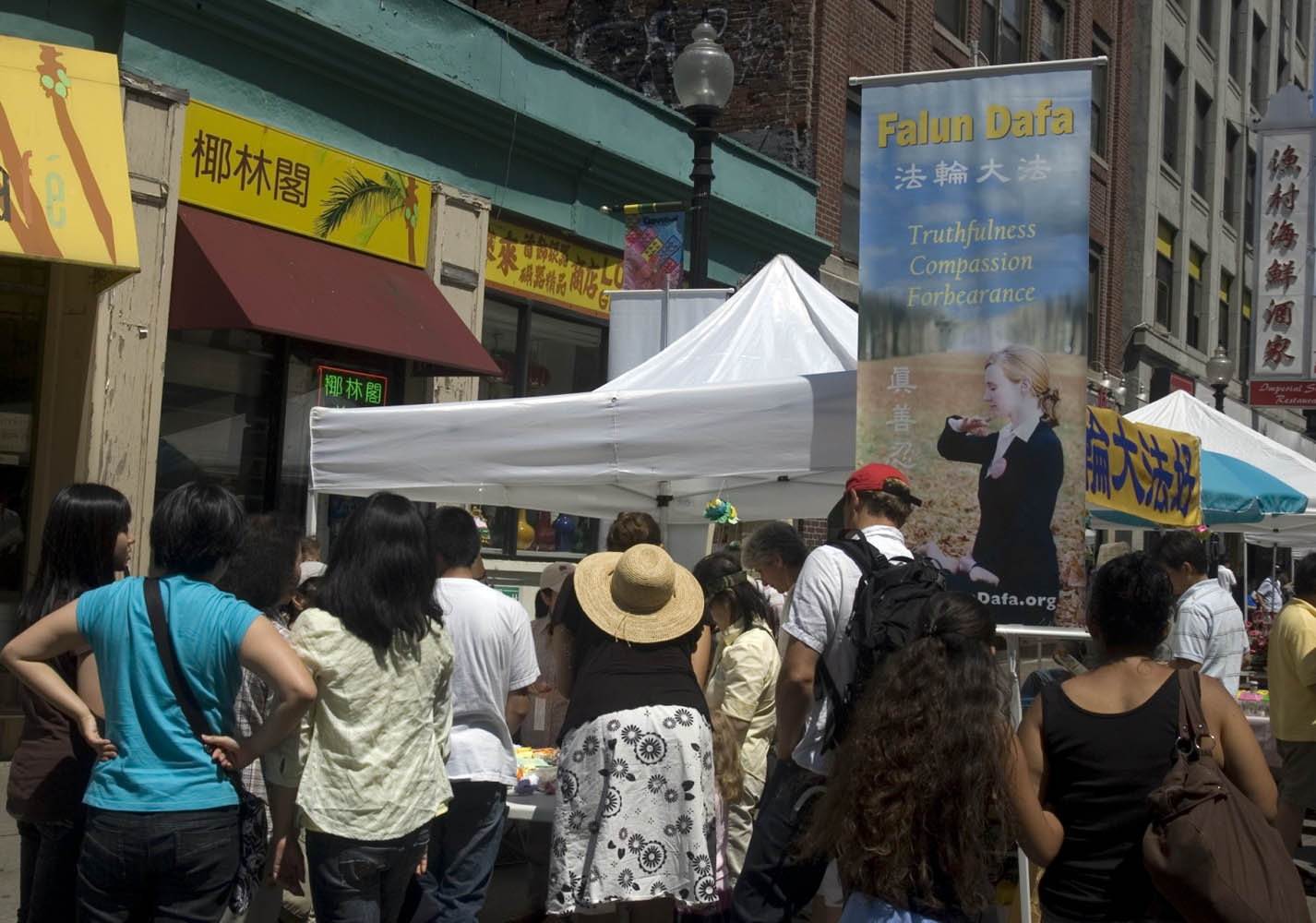 ![]() 波士顿华埠主街联欢节活动中,法轮功展位吸引很多路人驻足观看 |