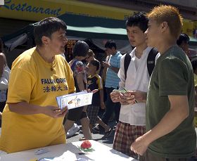![]() 年轻华裔认真地听法轮功学员讲真相。 |
