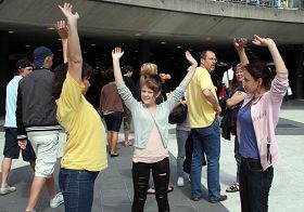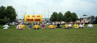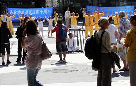 在优美的炼功音乐伴随下法轮功学员向人们演示舒缓、祥和的法轮功五套功法。吸引了很多游人驻足观看,有的当场就要学功。一位女士在活动现场站了两个多小时,并详细地打听了炼功点的地址。