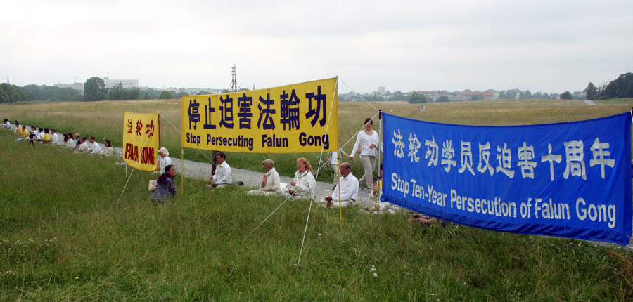 晚上六点,法轮功学员又集中在瑞典中使馆前,抗议中共对法轮功修炼者长达十年的残酷迫害。他们打出了“停止迫害法轮功”、“声援五千七百万人退出中共”的横幅,整齐的静坐在草地上,点亮烛光,悼念那些被中共迫害致死的大陆同修,并向执勤的警察及过往的路人讲真相。