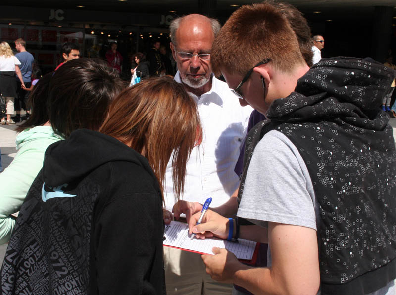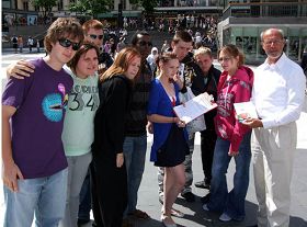 有一组年轻人他们不知道这里发生了什么事情,当他们听完法轮功学员讲真相后立即签名。并高兴的和学员合影以表示支持法轮功反迫害。