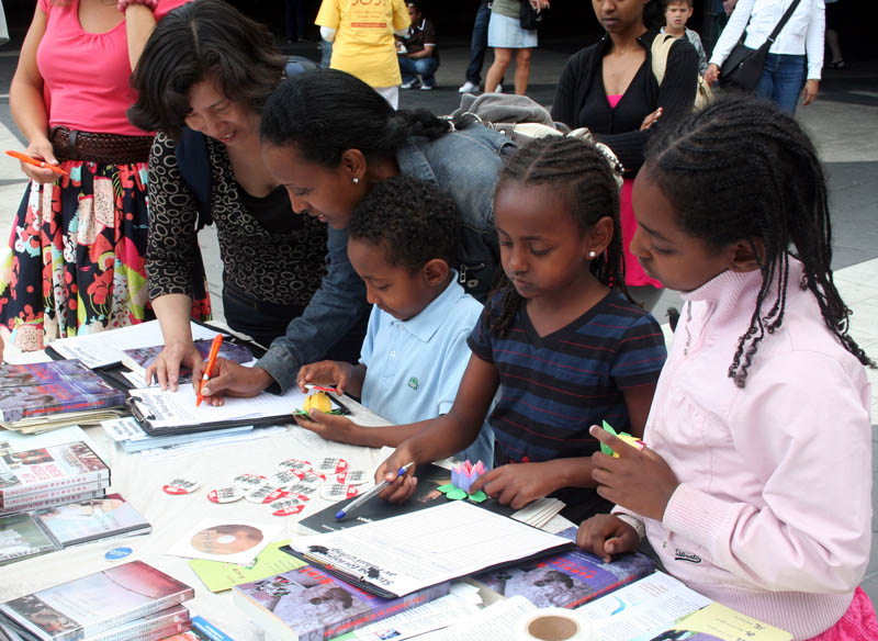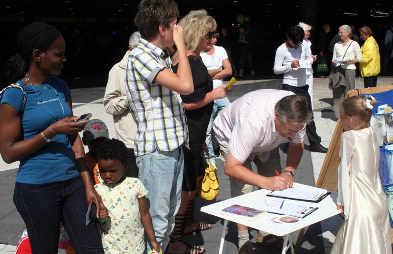 一位居住在瑞典二十多年的女士叫Theda Licen,她认真地在签字簿上签上了自己的名字后,让她的三个孩子也来签了各自的名字,她最小的儿子才只有五岁。她说“我非常相信这一切都是真实的。我有一个朋友她从中国抱养了一个孩子,她经常的去中国。我们都很关心中国的事情,我们经常的看报道,中国发生的对人权的迫害我经常和孩子们讲,我认为大家都应该的知道并关注。”