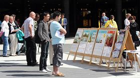 ![]() 民众观看真相展板了解法轮功 |