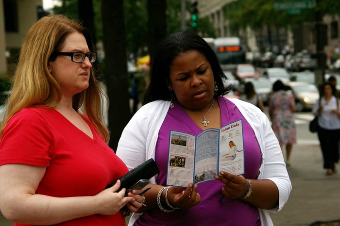 一位来自罗马尼亚的路人莫尼卡(Monica)经过集会现场时,举着双手说:“我支持你们!我敬佩你们!”当记者采访她时,她双手捂着胸口说:“对不起,我的英文很有限,我只能用我的心来表达。我非常的敬佩今天在这里的这群人,他们能顶住十年的打压而不败。我来自也曾经在共产党独裁统治下的国家,知道它的残暴。我支持今天在这里的这群人,我相信他们一定会成功的。”