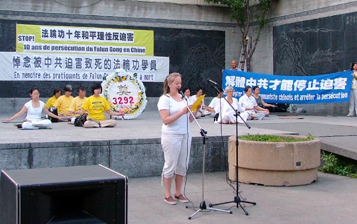 法轮大法佛学会代表契普卡(Joel Chipkar)宣读了加拿大法轮大法佛学会声明。他指出,十年前的今天,七月二十日,开始了当今社会中最残酷的、最不公正的迫害。迄今已有三千二百九十位学员迫害致死,八万七千人次遭受酷刑,被使用了一百多种的酷刑。联合国一份报告指出中国监狱里受酷刑折磨的受害人百分之六十六为法轮功学员。更令人发指的是,有报告指出,法轮功学员被活摘器官。然而,法轮功学员过去十年和平的、不屈不挠的反迫害努力以及世人对其的支持给中国人民带来了希望。