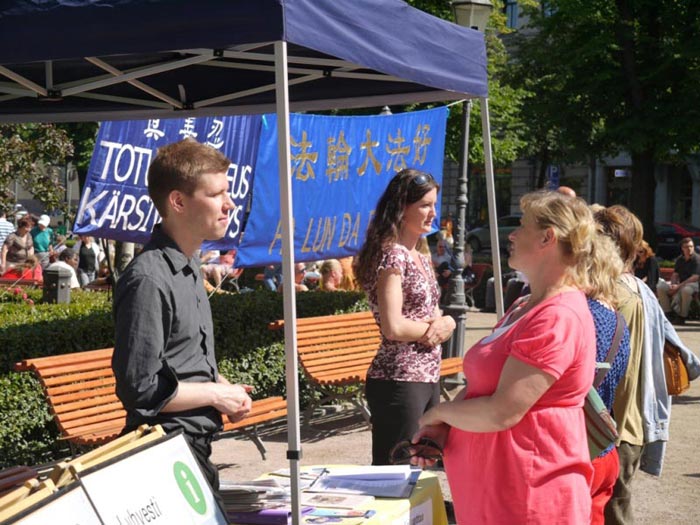 有两个老年妇女过来与学员讨论。其中一人住在赫尔辛基,她已经看到了法轮功学员多次在火车站活动,现在把朋友也带来看法轮功。她的这位朋友住在丹麦,她在那里也看到过法轮功。她们都知道共产党对法轮大法的残酷迫害,她们认为,共产党是“非常不好的,它害怕法轮功学员用自己的脑子去思考 ”。