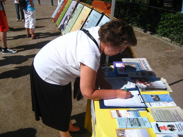 悠扬的音乐声,舒展的功法吸引了众多民众的目光,也引起人们的思考,一位母亲对学员说,这看上去像一个和平使者,她非常想知道为什么共产党迫害法轮功。学员告诉他,在中国,共产党只是因为担心众多的人修炼法轮功,就进行了迄今为止整整十年的迫害。这位妇女不仅自己,还让自己十二岁的女儿也签署了声援书。