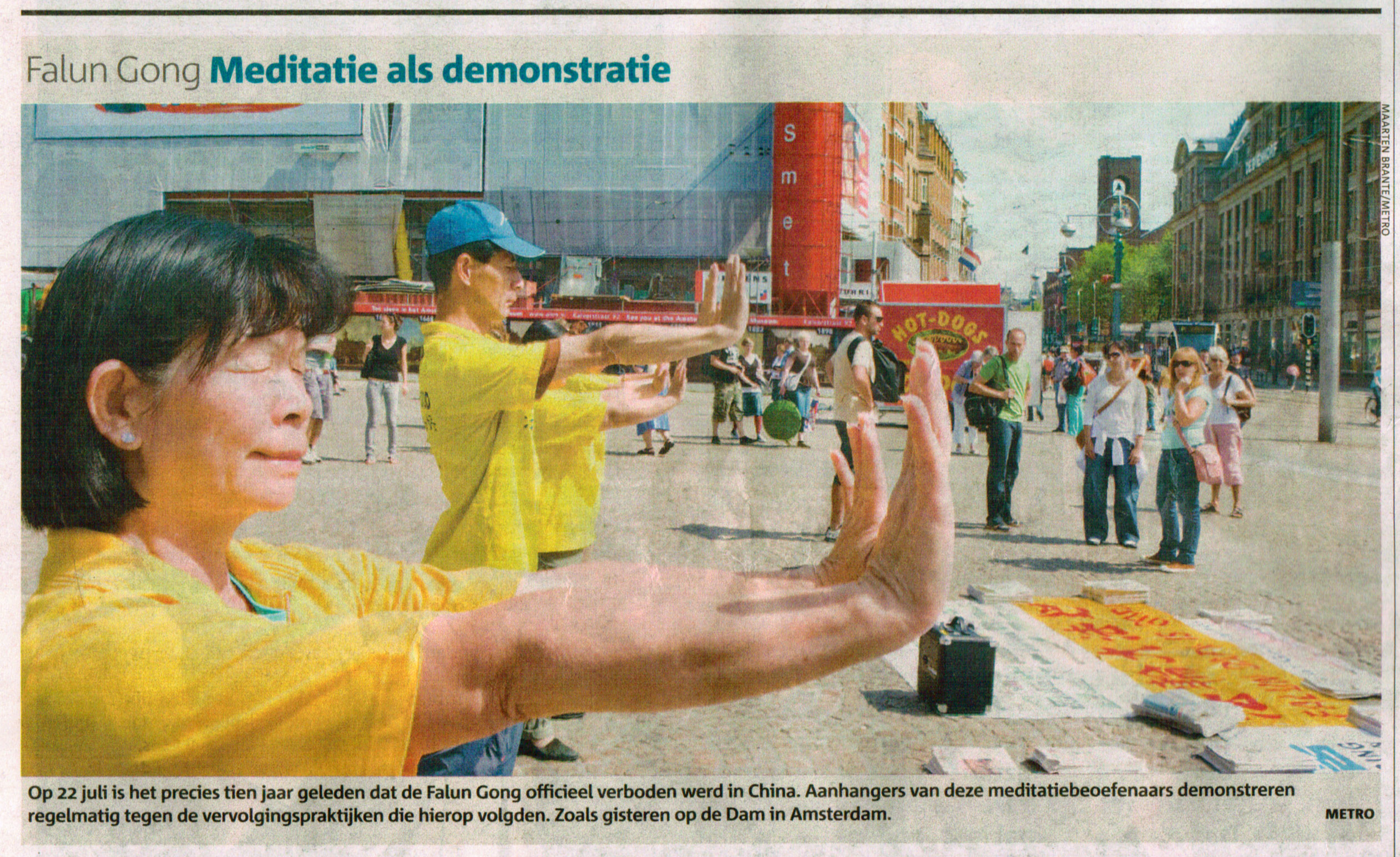 荷兰著名的地铁报Metro在十七日用了大幅版面刊登了学员在Dam广场炼功的照片。