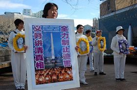 集会上有两位小姑娘的坚毅身影引人注目;年仅十七岁的施佳韵和二十三岁的璐璐,他们手捧展板,呼吁营救在中国被非法关押的母亲汪宇清和王丽阁。施佳韵年仅七岁时,母亲汪宇清就因为修炼法轮功被非法关押在洗脑班和劳教所五年;二零零八年在北京奥运前,汪宇清再次被非法劳教一年;今年劳教期满,却不见放人,广东当局还拒绝告知家属汪宇清的下落;几个月后,通过海外明慧网的报导,施佳韵才了解到中共已经将汪宇清转移到武汉的洗脑班继续迫害。