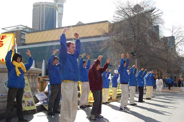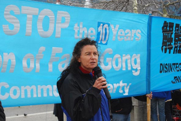 国际大赦奥克兰的负责人玛格丽特·泰勒(Margaret Taylor)在集会中发言说:“今天我们在这里抗议法轮功被迫害十年。中共当局持续迫害基督徒、西藏僧侣、异议人士,而法轮功遭受的迫害是最严重的,很明显的一个例子是去年北京奥运前,数千法轮功弟子被拘捕,送去劳教,遭受折磨。一个典型的被迫害致死的法轮功学员的例子是毕业于北京大学的歌手于宙,于宙去年一月和他的太太许那一起在北京被捕,一个月后他的家人被告知于宙已经在拘留所死亡,给出的原因是疾病死亡,当局还拒绝将尸体交还家人,他的太太许那也被判处三年监禁。”