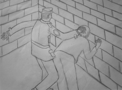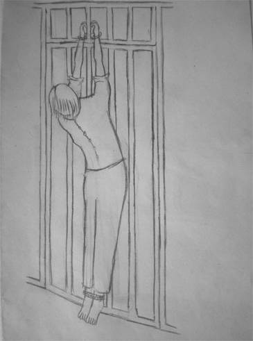事发当天,恶警将刘丹绑架到鸡冠区公安分局。恶警王伟军将刘丹双手背铐,让其长时间面墙体罚,并用污言秽语谩骂。夜间,又将刘丹的双手高高的倒扣在铁门上,绑上双脚,人只能弯腰头朝下,此种姿势让人疼痛难忍(演示图1)。之后,王伟军强迫刘丹摁指纹,刘丹不按,他就让刘丹钻到凳子底下,被刘丹拒绝,王伟军一脚把刘丹绊倒,刘丹的头部重重的撞击到地面上,然后王强行把刘丹的双腿并在一起,头贴在双腿上,用凳子压在刘丹的背上,王坐在凳子上一上午(演示图2)。